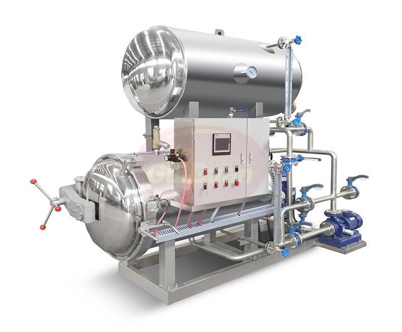二鍋一罐水浴式殺菌鍋,高溫短時間滅菌,事先將殺菌罐內的水加熱到滅菌所要求的溫度,從而縮短了滅菌時間,提高了工作效率。